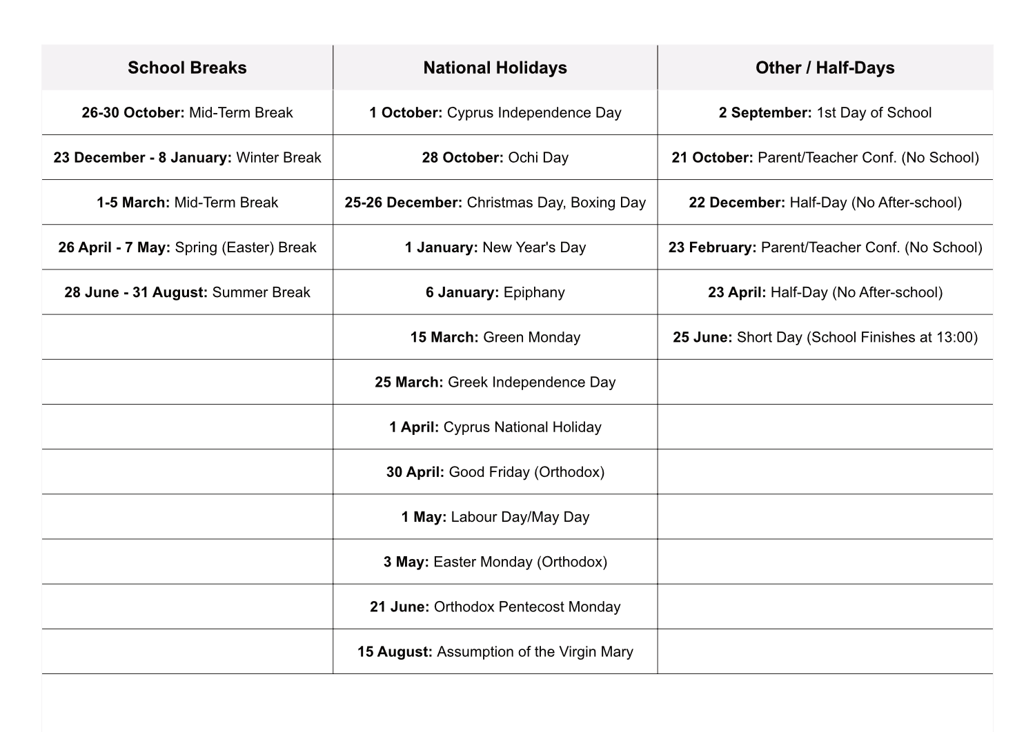 School Calendar for the next academic year.